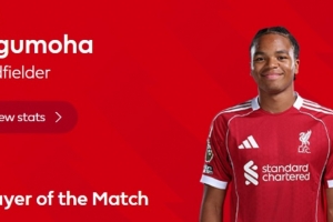 17岁225天!英超官方:恩古莫哈当选利物浦vs富勒姆的全场MVP